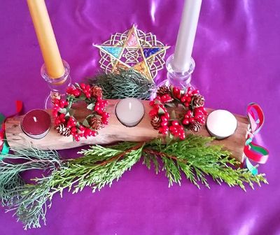 Altar Decorations: Altar circle with Holly [ Goddess] Protection. Mistletoe [God] Fertility. Success. Ivy. Pine. Pinecones. Orange slices. Cinnamon sticks. Star shaped objects.